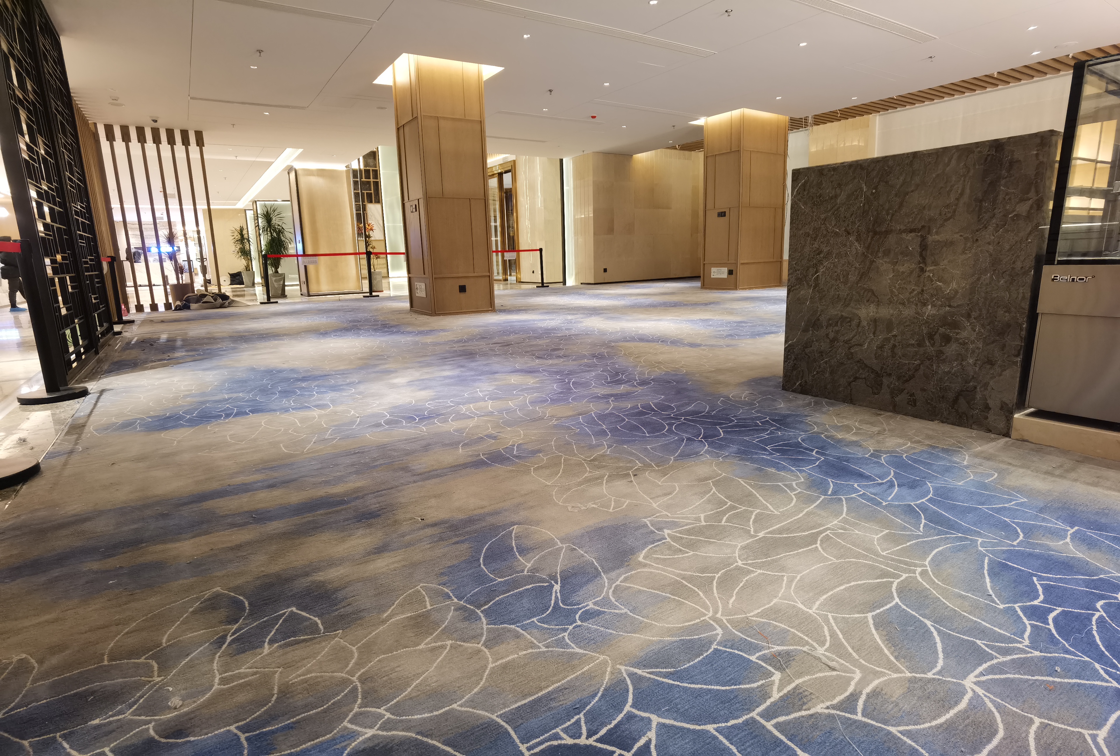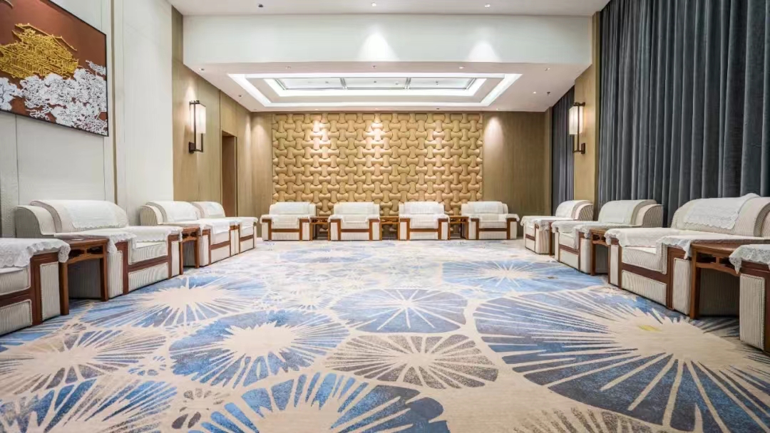 我公司2021年9月中标该项目地毯工程后,对酒店内不同区域地毯应用要求进行了分析,并与国内专业酒店设计公司DDA、威海海马地毯工厂设计团队紧密配合,按照客流量大小及普通客房、会议室等场所的使用需求,选用了绒重、绒高不同的阿克明斯特机织羊毛地毯;对高级客房、总统套房以及餐厅包间,采用了绒重、绒高最高等级的新西兰特级羊毛地毯。从而在满足了使用功能的前提下,大大节约了整体造价(相比全部使用手工羊毛毯降低约40%),20多种不同的花色也充分配合了不同区域的环境特征,与内装整体风格相得益彰。