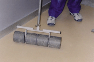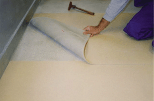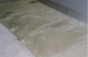 ◇卷材铺贴时,将卷材的一端卷折,先清扫地坪和卷材背面,在刮胶与地坪上;