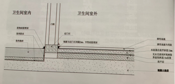 这样做就阻断了卫生间地砖之下的水向房间的找平层渗透路径。请注意,卫生间的水通过过门石之下,以液态水渗透出来,而破坏地板的水,是进入房间的水,以气态蒸发上升,所以卫生间过门石之下需要做防水阻断而不是防潮。