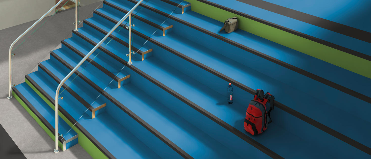 楼梯的安全性至关重要。Tarkett的楼梯踏步解决方案适合高人流量区域,提供防滑及抗刮擦功能。此外,我们还使用了对比明显的颜色指引方向。