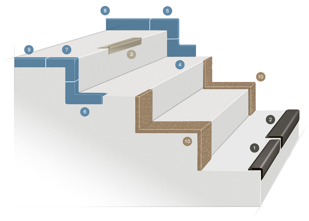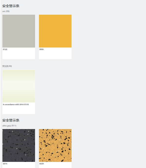 可以在楼梯踏板区或前缘垂直部位2或3 cm的位置安装宽度为 2、3、4或5 cm (5 cm 不适用圆浮点表面产品上) 的uni单色安全警示条, 有0122(浅灰色)和0895(亮黄色)可供选择。